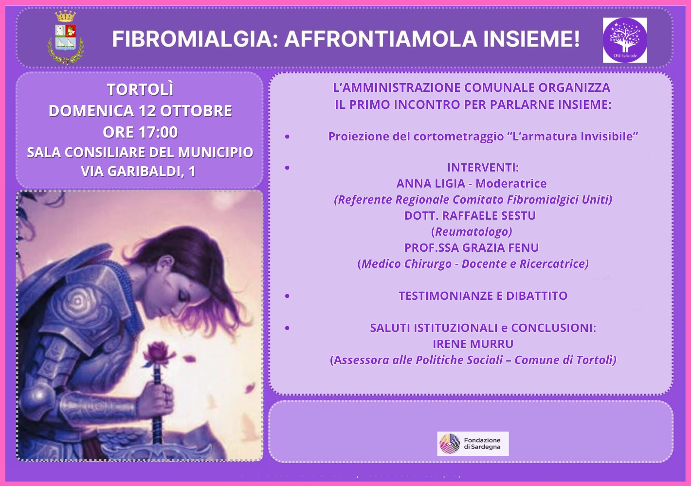 Il Comune di Tortolì invita la cittadinanza a partecipare al primo incontro dedicato alla Fibromialgia, in programma per domenica 12 ottobre alle ore 17:00 nella Sala Consiliare del Municipio, in Via Garibaldi n. 1